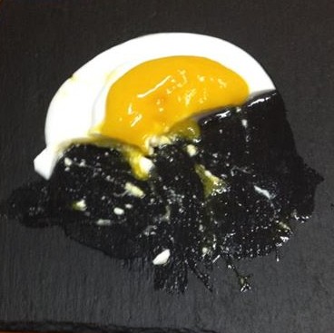 With all this done take out the egg whites and with the back of a spoon and where you think the yolk will go, lightly press to form a divot. Lastly with a spoon, pick up one of the spheres and place in the divot and voilà, you have a dessert egg.