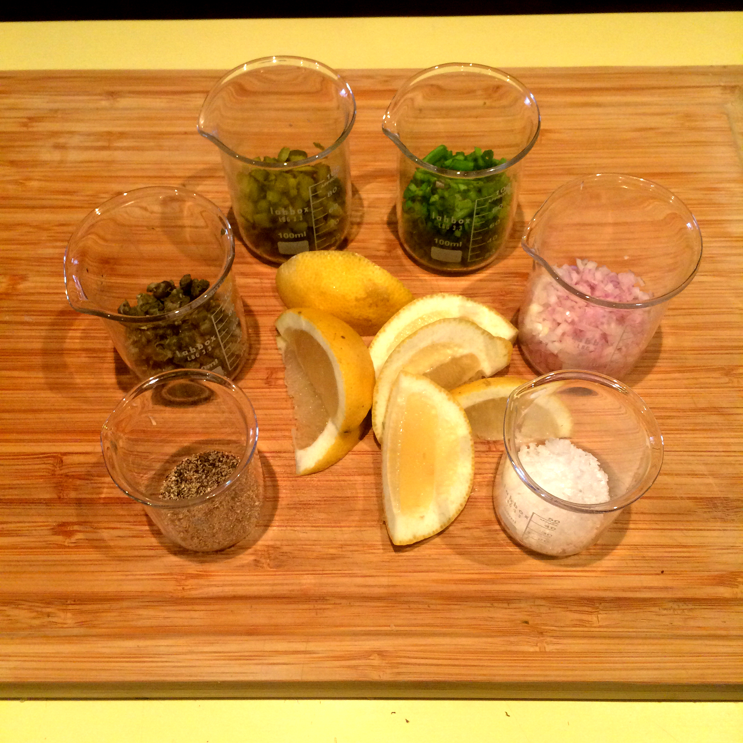 While the meat is in the freezer, finely dice or mince the remainder of the ingredients mentioned above and either have them ready on a board or in small containers (in my case I like to use beakers). ChefSteps does it different (Click for link) but we placed all the ingredients into a bowl to combine. Cut your baguette into 1cm pieces and toast to your liking.