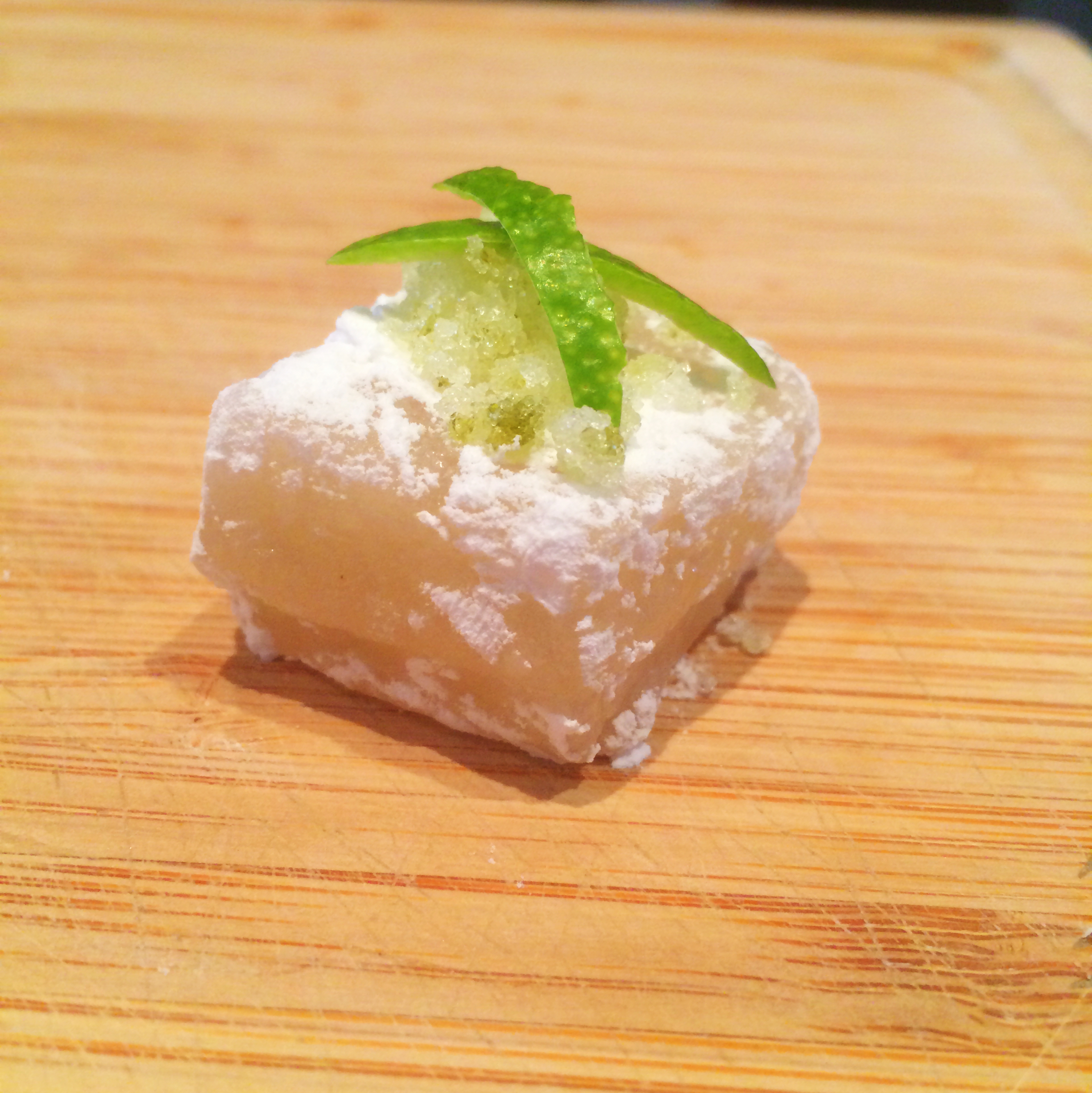 To serve, slice the set marshmallow mixture into equal sized cubes then remove from the baking tray. Grab the marshmallow coating and toss the gin and tonic marshmallow cubes. Finally, top each of the marshmallows with a pinch of cucumber sugar and a little lime zest, ENJOY!!