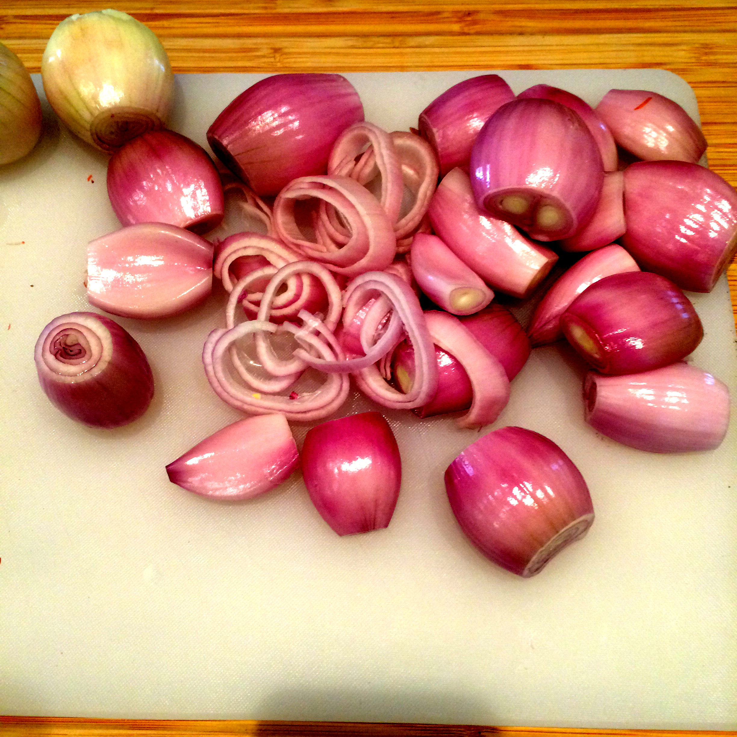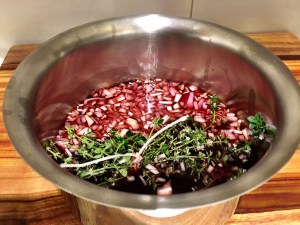 2. Heat the marinated mixture until almost all the liquid has evaporated, making sure to stir regularly to prevent the shallots and garlic from burning. Remove from the heat and discard the thyme.