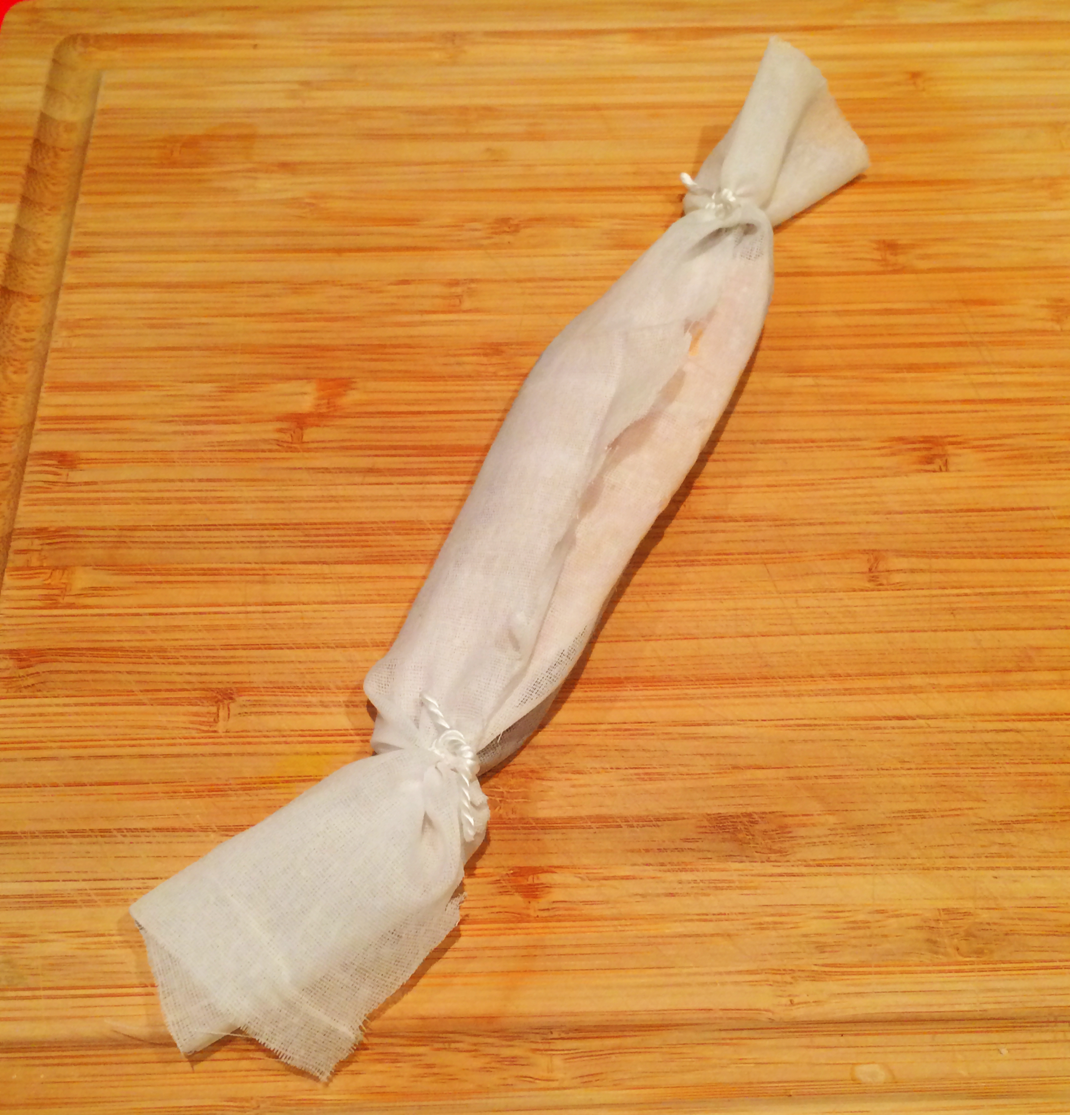Remove from the fridge, wash the breasts of all the salt and pat completely dry. Wrap in the muslin cloth and tie with the butchers twine (click to see how to tie). Next you want to weigh your pieces of meat because to tell if it is ready it will have lost 30% of its original mass. Now to hang in my Vintec wine fridge I snapped a bamboo skewer in half and used that to thread through the loop in the end of the tied up meat hanging from the shelf.