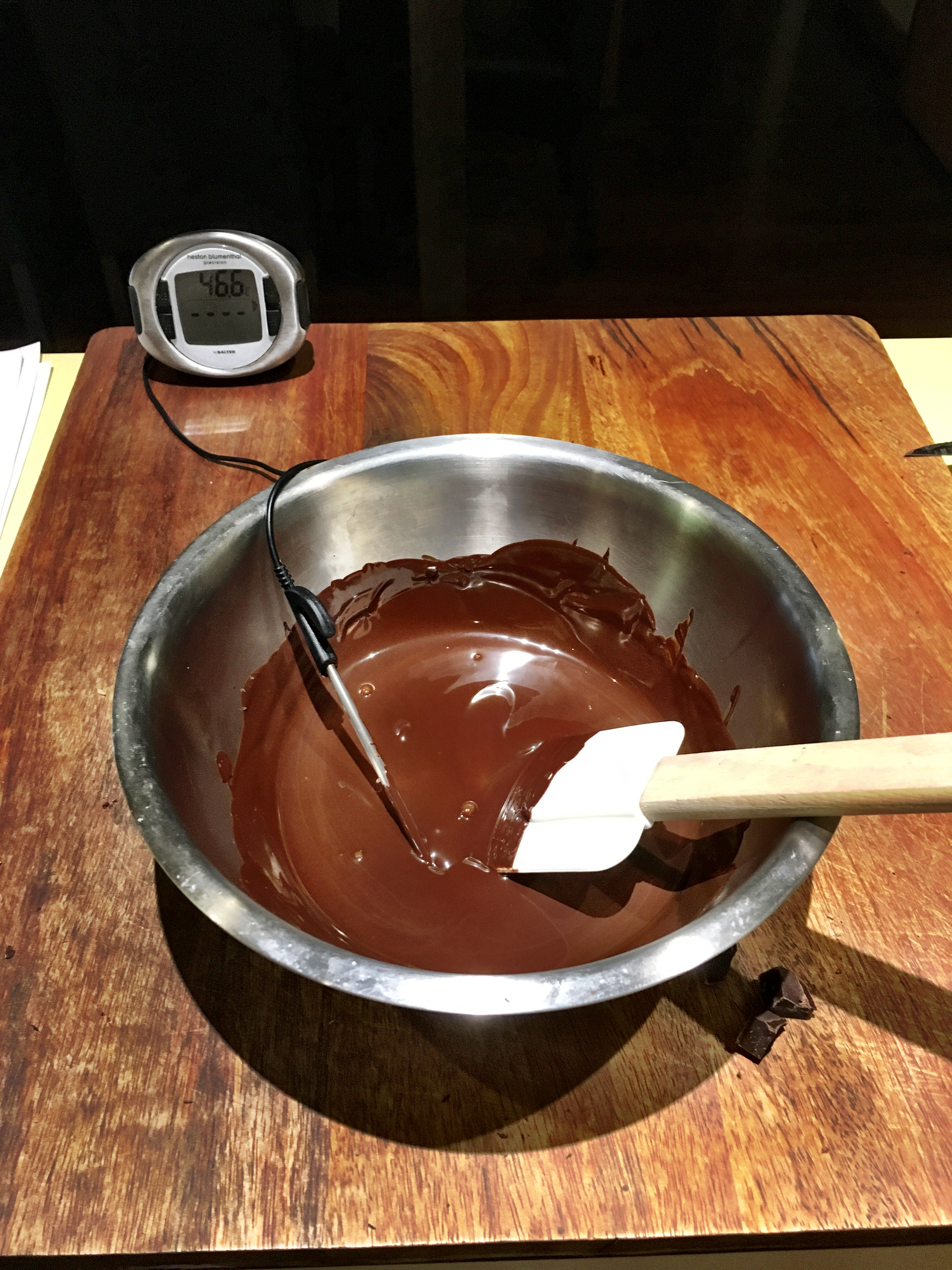 30. Return metal bowl to the pot of hot water and stir chocolate until temperature reaches 32ºC. Ensure the chocolate does not go over 35ºC.
