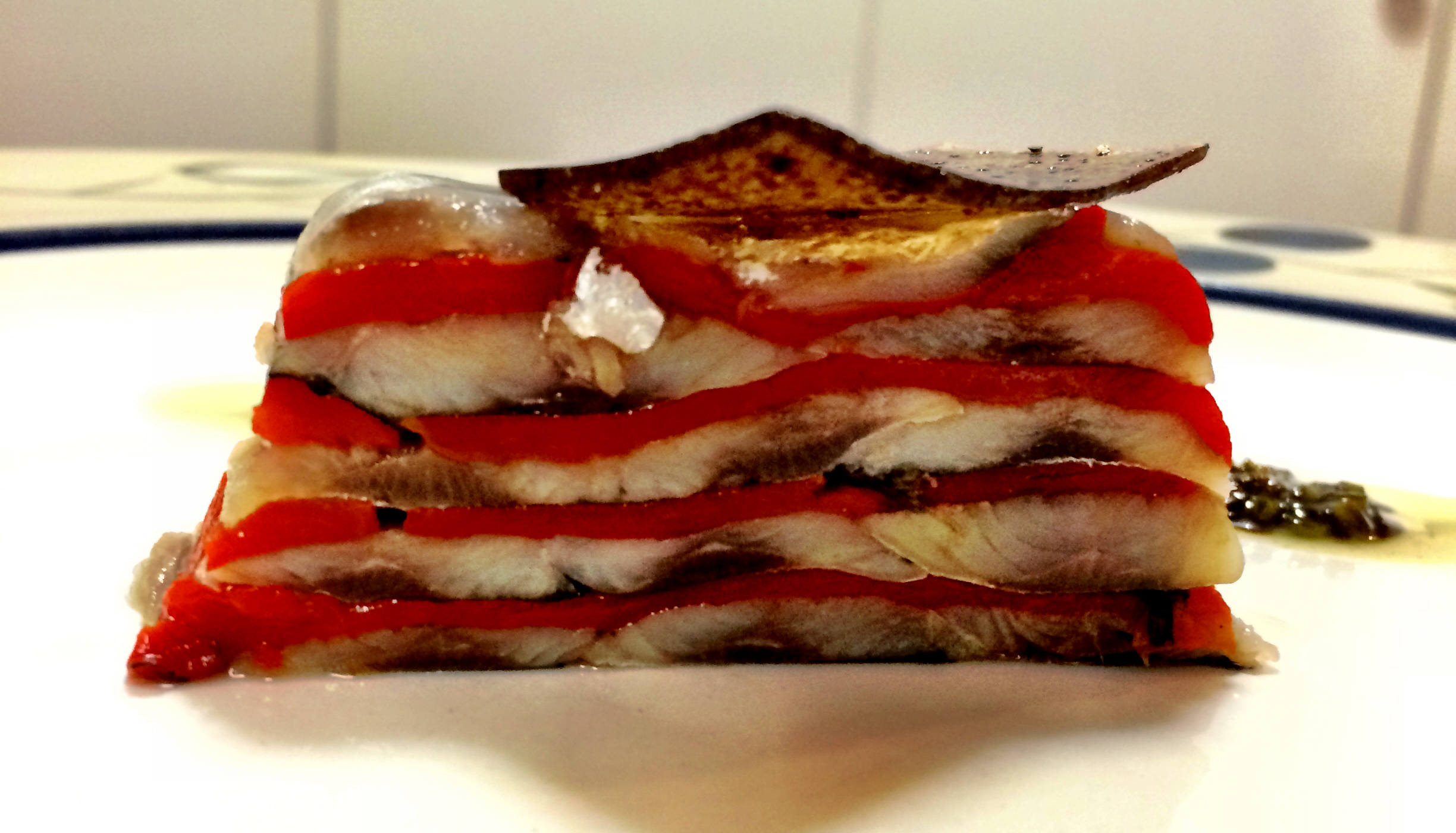 Terrine of Sardine and Piquillo Peppers, Black Olive Caramel and Spring Onion Vinaigrette