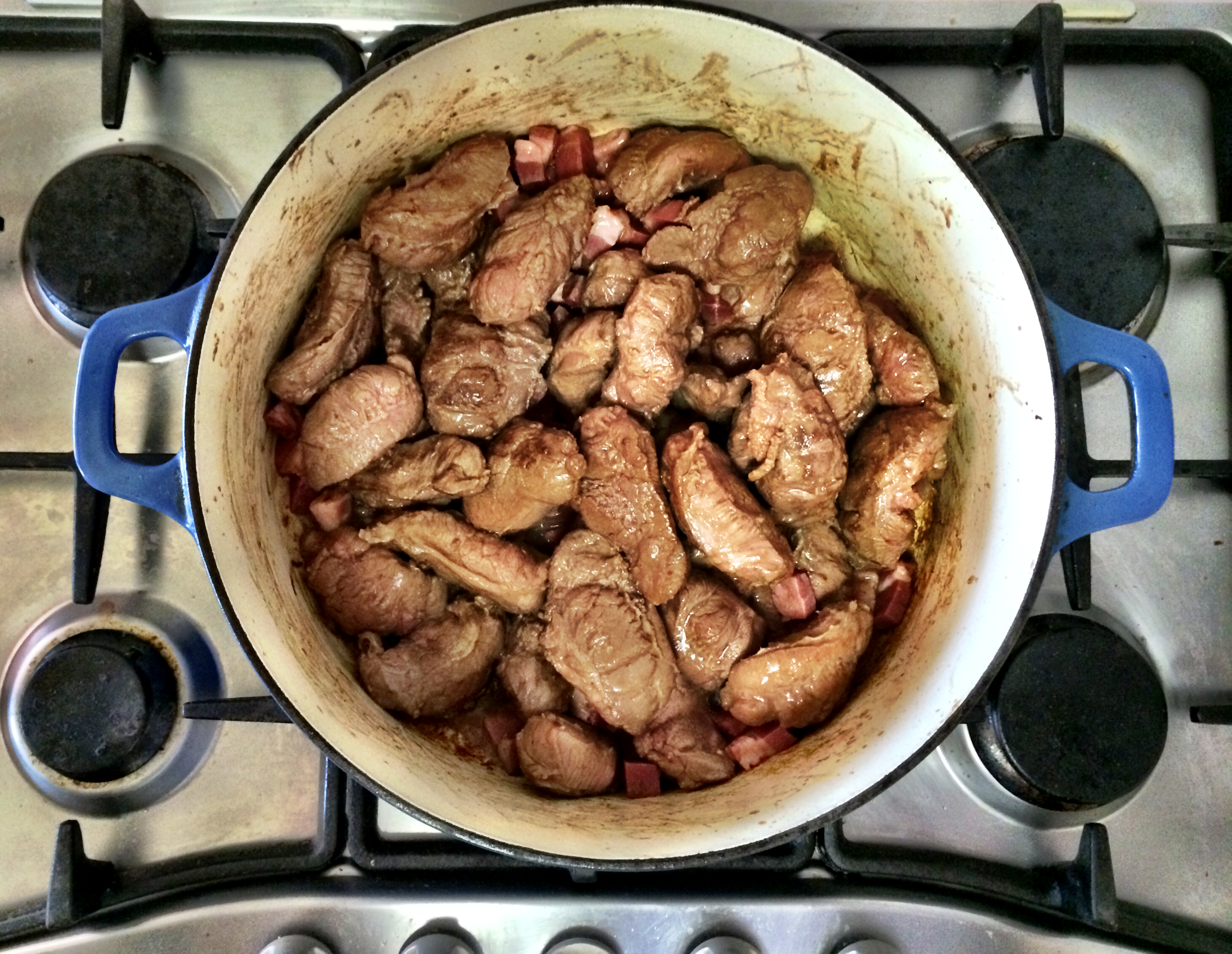 First heat the a heavy- based casserole pot (I use Chasseur, they are just as good as le Creuset and way cheaper) add the pork cheeks and cook on a medium heat turning occasionally so that they a brown all over. Next lower the heat and add the onions, lardons and garlic stirring frequently until the onions have softened. Stir in the flour and cook for two minutes. After two minutes, gradually stir in the red. Once all the wine is in add the Bouquet Garni, pour in the water and simmer for one hour.