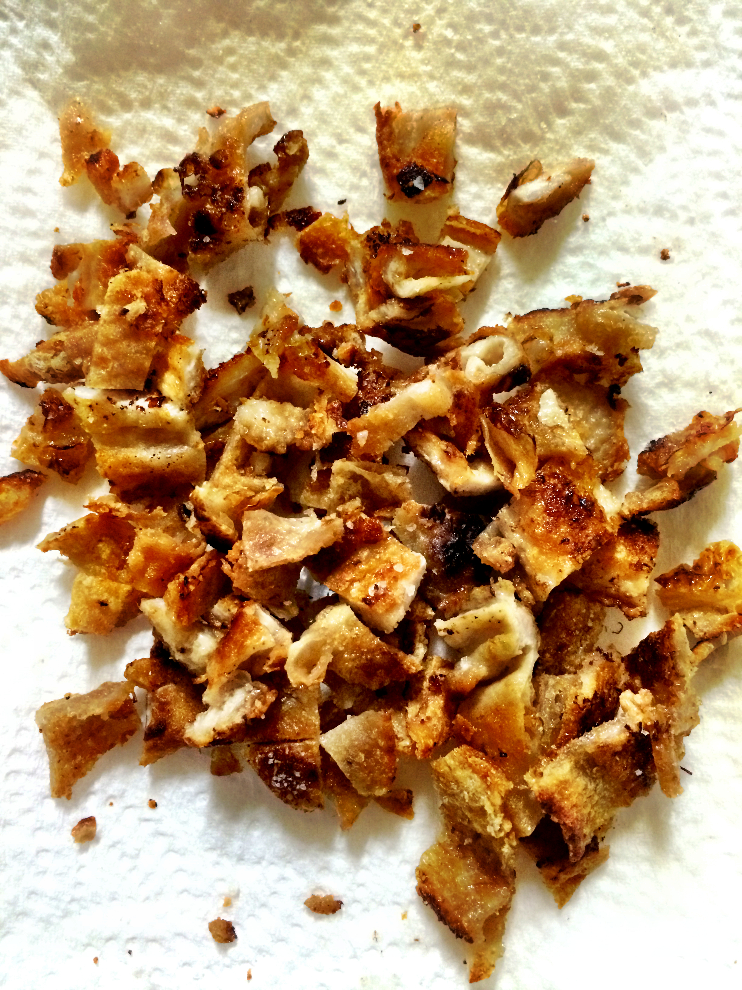 While the soup is cooking, place the chicken skin in a large non-stick fry pan over medium heat. cook for 6 minutes on each side or until the skin is crisp and golden. Drain on absorbent paper and sprinkle with sea salt flakes.