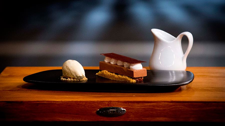 32. Remove Chocolate Parfait from blast chiller and unmould. Use the template as a guide to cut to size. Transfer portioned parfait into a paper-lined container and store in the freezer until required.